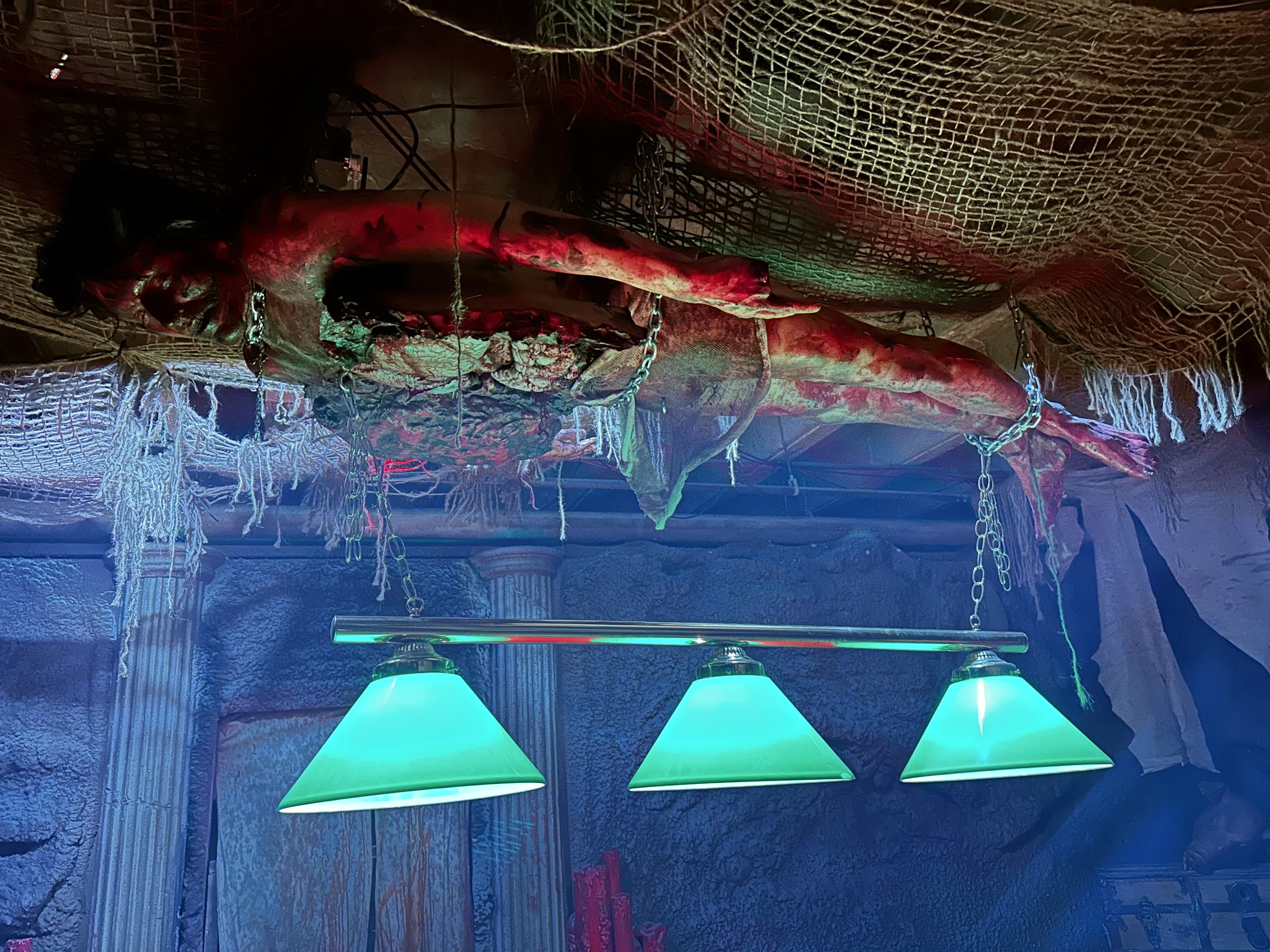 The pool room is also themed, with a very unusual lighting fixture and special effects going off occasionally (thunder and lighting flashes).